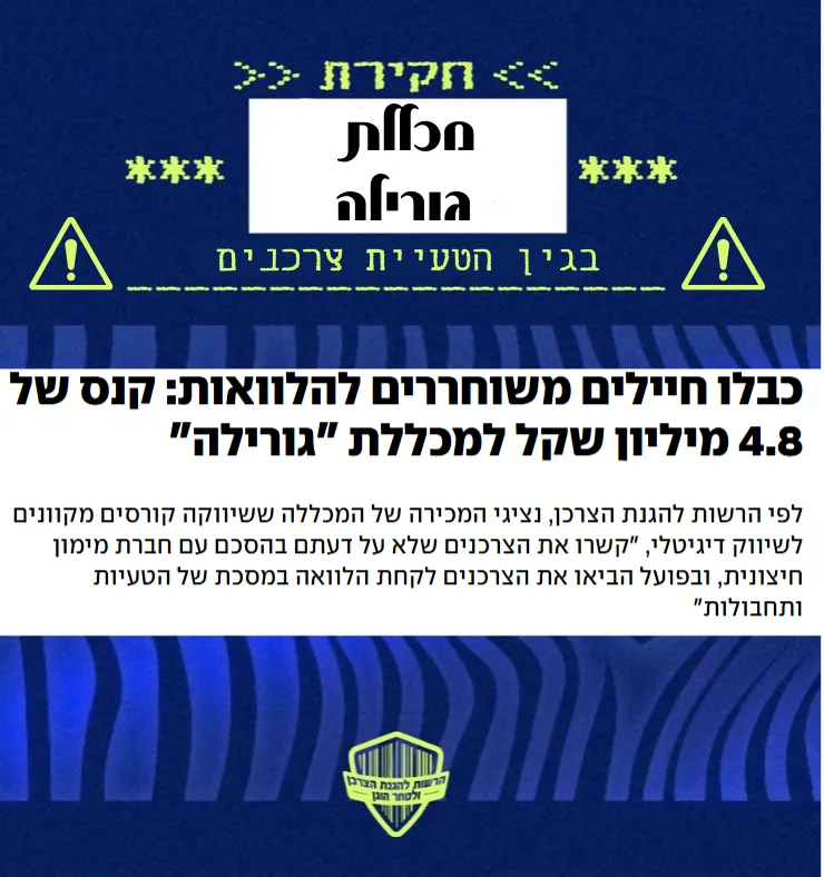 أعلنت سلطة حماية المستهلك والتجارة العادلة عن عزمها فرض عقوبة مالية على "غوريلا كوليدج المحدودة" و"إيه. إس. ماركتينغ سنتر المحدودة" و"بوزايلوف يعقوب" بقيمة 4,867,184 شيكلاً، بعد وجود أسباب معقولة للاعتقاد بانتهاكهم أحكام قانون حماية المستهلك لعام 1981.