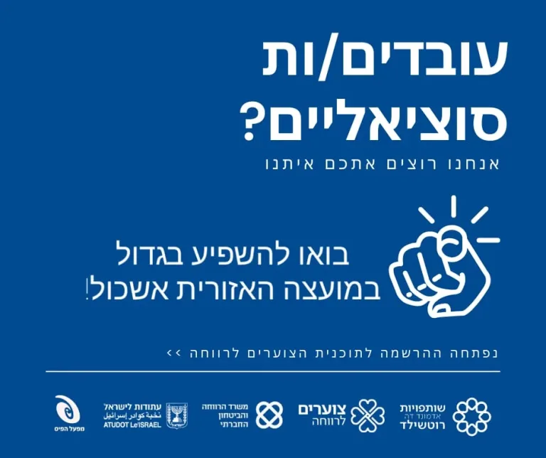 تبحث عن أفضل مرشح لمنصب قائد السياسات والاستراتيجيات في المجلس الإقليمي إشكول. لا تُفتح أبواب الترشح لبرنامج يهدف إلى إعداد الجيل القادم من قادة الرفاه في إسرائيل كل يوم. تفتح الآن باب التسجيل في البرنامج الرائد "ضباط للرفاه"! برنامج فريد للأخصائيين الاجتماعيين ذوي الخبرة الذين يرغبون في اتخاذ خطوة مهمة إلى الأمام.